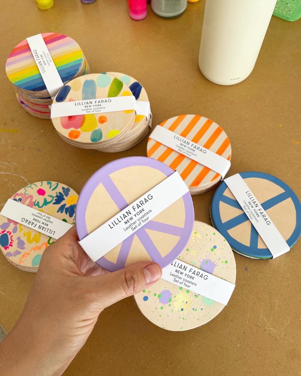 I am an artist with man hats, I paint leather and make ceramics and colorful prints. Bright + happy